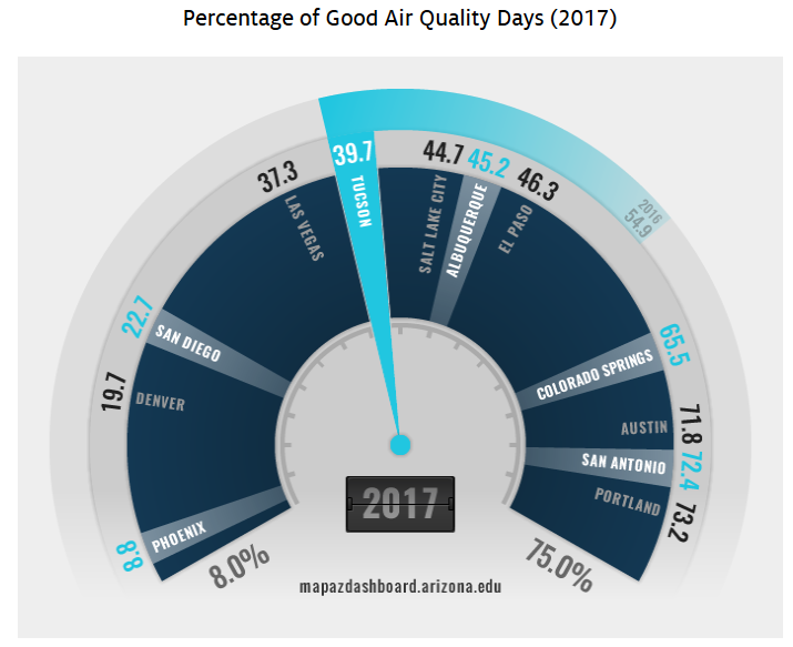 The Tucson Metropolitan Statistical Area (MSA) ranked eighth out of 12 comparable western MSAs in the percent of good air quality in 2017. Tucson’s air quality was rated “good” 39.7 percent of the time, a decline from 54.9 percent in 2016. Phoenix was last among the 12 western metropolitan areas, with only 8.8 percent of days in 2017 considered “good”. Days are rated “good”, according to the U.S. EPA, when air quality is satisfactory and air pollution poses little or no threat. The annual share of good air quality days in Tucson was at an eighteen-year low in 2017.